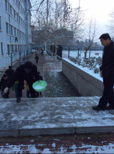 昨晚的一場大雪將科大的校園裝扮得銀裝素裹、分外妖嬈,瑞雪給同學(xué)們帶來了別樣的歡樂,但也給校園安全帶來了許多隱患。為盡快掃雪除冰、暢通道路、消除隱患,確保師生在校的安全和教學(xué)的正常進(jìn)行,項(xiàng)目全體員工早上6點(diǎn)到崗,在項(xiàng)目經(jīng)理的帶領(lǐng)下齊心聚力,鏟的鏟,推的推,掃的掃,在主干道和臺階上進(jìn)行撒鹽,并及時(shí)清理雪水,保證了道路的暢通。雖然早上的氣溫很低,但項(xiàng)目員工不畏嚴(yán)寒,熱火朝天地為校園安全盡自己******的努力。經(jīng)過一個(gè)多小時(shí)的奮戰(zhàn),教學(xué)樓及公寓樓道路、臺階全部清掃干凈,為學(xué)校師生出行提供了有利條件。