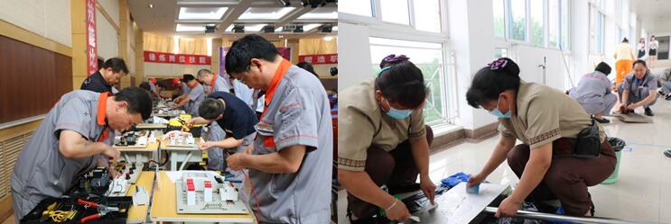 大賽第三輪是保潔和工程的現(xiàn)場實(shí)操,保潔的主要考核內(nèi)容為地面清潔以及塵推使用、不銹鋼清潔、保養(yǎng);工程的考核內(nèi)容是三相電表帶互感器連接以及電機(jī)正反轉(zhuǎn)控制(互鎖)。雖然比賽是在室內(nèi)進(jìn)行的,但炎熱的天氣并沒有因?yàn)榧ち业谋荣惗兴羟椋瑓①惾藛T揮汗如雨,這并不影響選手的專注和熱情。隨著秒表的記錄,選手一個接一個的舉手示意完成比賽。比賽的過程、成果的展示,體現(xiàn)著選手精湛的技能。