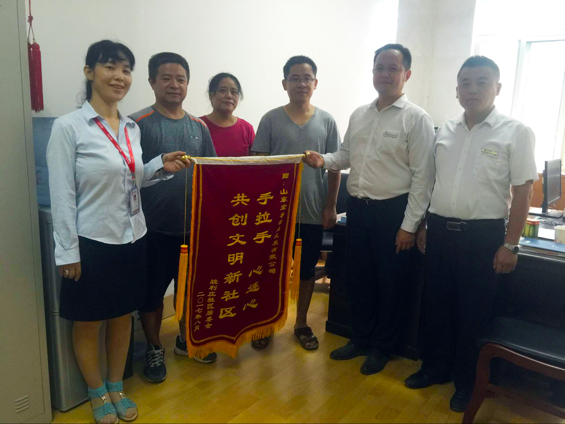 2017年8月16日上午11點勝利莊社區(qū)居委會自發(fā)組織把一面印有“手拉手、心連心、共創(chuàng)文明新社區(qū)”字樣的錦旗送到山東科技大學濟南校區(qū)物業(yè)辦公室,表達他們對山東科技大學濟南校區(qū)物業(yè)給予社區(qū)創(chuàng)城工作大力支持與幫助的感激之情。