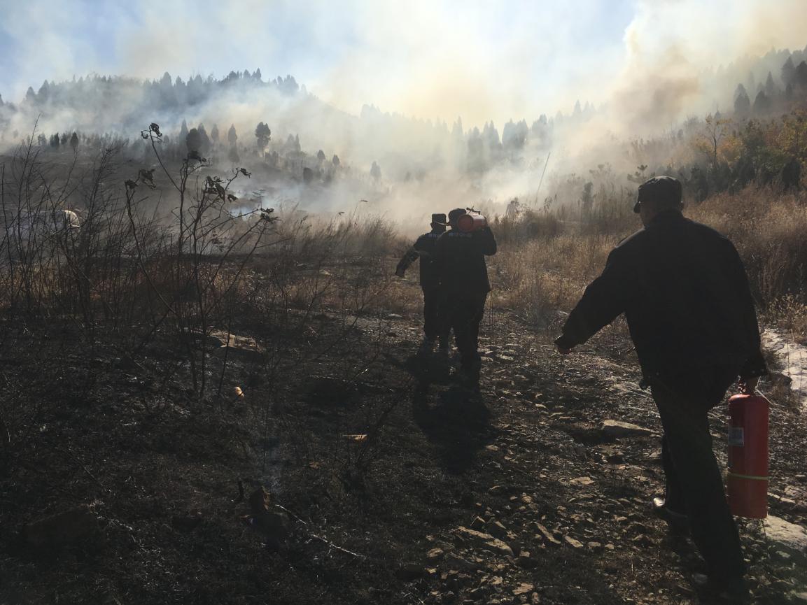 11月15日11點20分,保安員發(fā)現蓮花山殯儀館西山林發(fā)生火災,情況緊急且明火嚴重,經與甲方領導匯報火災情況后,立即報警,并迅速組織可調動的所有保安人員帶著20多具滅火器直奔現場。由于山體茅草較高,風勢較大,火勢向殯儀館方向延伸。在消防人員未趕到的同時,咱們的保安人員已從山腳趕到的山腰開始滅火,經過10多分鐘奮戰(zhàn),3輛消防車才逐漸趕到現場,并從山腰火勢嚴重區(qū)域進行大規(guī)模的滅火,經過20分鐘的撲救,山體明火已經消失,只剩黑煙。