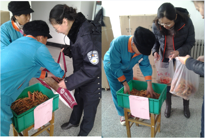 我公司自承接山東警察學(xué)院物業(yè)服務(wù)以來,在征得甲方領(lǐng)導(dǎo)同意的前提下,積極利用學(xué)校閑置資源加以開發(fā)利用,員工利用業(yè)余時間開墾荒地,在項目保潔、綠化部人員辛勤勞動下,種植的綠色、無公害胡蘿卜成熟了。收獲季節(jié)沒有忘記學(xué)院師生,并于2014年11月24日下午13:00點,項目人員將剛剛出土的新鮮胡蘿卜分與山東警察學(xué)院師生共同品嘗,享受綠色、無公害胡蘿卜的美味。剛開始大家都拘謹(jǐn)不好意思來拿,可是品嘗過的師生都相繼拿著袋子來裝,嘴里還說著:“太甜了”,“真好吃”,“謝謝!”等感謝的話語,讓我們員工心里感覺更甜了。隨著胡蘿卜發(fā)放完畢,本次活動圓滿結(jié)束。