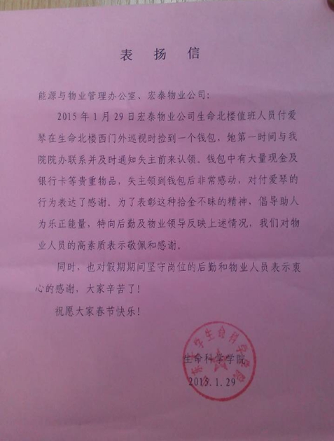 2015年1月29日,山大中心校區(qū)項目樓宇部值班人員付愛琴在生命北樓西門外巡視時撿到一個錢包,包內(nèi)有大量現(xiàn)金及銀行卡等貴重物品,她第一時間與院辦聯(lián)系并及時通知失主,失主對她行為表示感謝,這種拾金不昧的精神,得到了院方領(lǐng)導(dǎo)的表揚(yáng),同時對宏泰物業(yè)人員的高素質(zhì)表示敬佩和感謝。