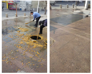 2015年3月20日,與往常的日子一樣,天津悅薈保潔服務項目的劉文勝經(jīng)理又早早到了項目現(xiàn)場。巡視過程中在廣場影城側(cè)發(fā)現(xiàn)因外管網(wǎng)跑水,造成大面積的化糞池清淤物。